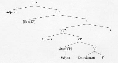 VP-niveau [PP,VP] of IP-niveau [PP,IP], terwijl complementen gegenereerd