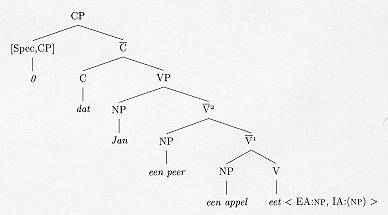 In het eerste V'-domein wordt het interne argument gevonden. Dit argument wordt geschrapt van de lijst. In het tweede V'-domein vinden we nog een NP, namelijk de NP een peer. Deze (niet-adverbiale) NP kan niet meer toegelaten worden: er is al een intern argument gevonden en er wordt maar één intern argument door V geëist en niet meer. Er is dus één argument teveel in de structuur. De structuur is om die reden ongrammaticaal. Het interne argument van eten is optioneel. Het mag dus wegblijven. Als we voor deze laatste optie kiezen, dan zouden we zelfs twee argumenten teveel hebben.